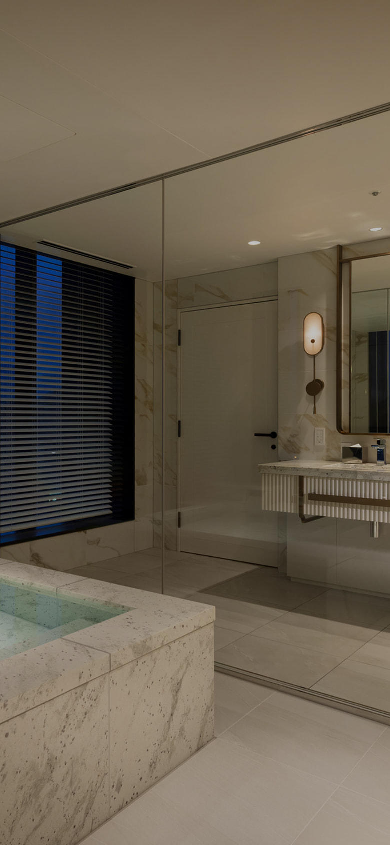 お風呂。それは日本人にとって、身体を清めるだけでなく、くつろいで心の疲れを癒すための大切な場所。だからこそ、リビングに溶け込むインテリアのように、サイズや形状、マテリアル、その一つ一つに物語があるこだわりのセレクトを。オーダーメイドによるデザイン性と、ユニットバスならではの高い機能性を融合し、洗練された空間をMUROは実現します。